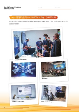Hon Hai Research Institute 院長序 執行長序 鴻海研究院2023年鑑 10/18鴻海科技日Hon Hai Tech Day(HHTD23) 除了與外界分享鴻海在半導體以及電動車領域的發展方向與最新進展,也展示了鴻海研究院 2023 年 最新的研究成果。 AI所跨時代智慧互動座艙。 合作網路牆。 通訊所講座。 半導體所─六吋碳化矽晶圓。 資安所─EV π Platform。 18 ɨʹ ᒿऎӺ৫ ʫ˖ ၚݺਗ JOEE ᒿऎӺ৫ ʫ˖ ၚݺਗ JOEE ɨʹ